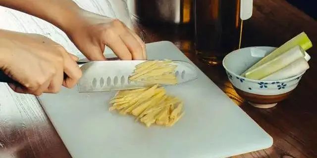 將準(zhǔn)備好的原材料切絲、切片備用。